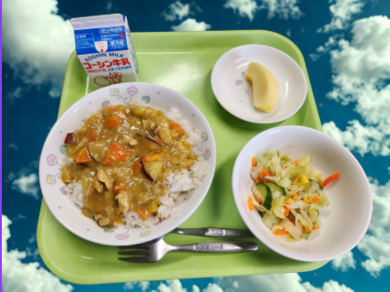 秋野菜のカレーライス・コールスロー・りんご・ 牛 乳