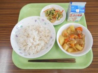 かけけんちんうどん、がんづき風黒糖蒸しパン、牛乳