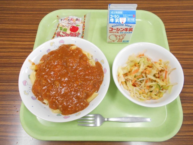 ペンネ・ボロネーゼ、レンズ豆のサラダ、お米deりんごのタルト、牛乳
