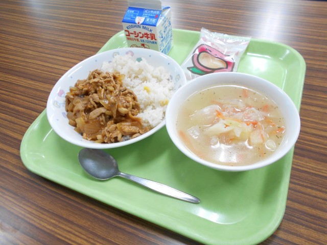 ガーリックライス、ポークチャップ、野菜のスープ、冷凍ピーチコンポート、牛乳