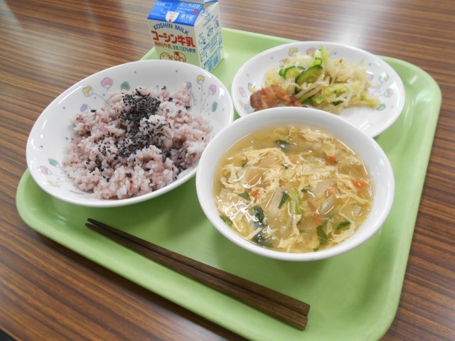 古代米赤飯、鶏肉の照り焼き、野菜の甘酢あえ、えのきと卵のすまし汁、牛乳