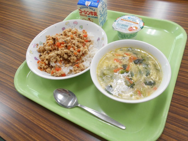 高野豆腐のそぼろ丼、卵とコーンのスープ、オレンジゼリー、牛乳