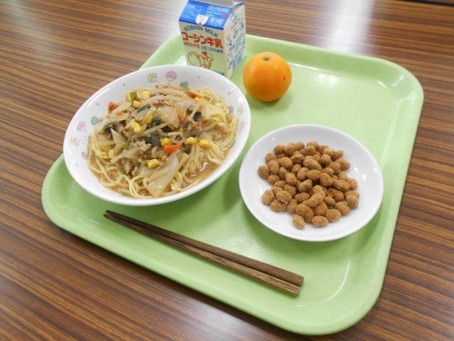 みそラーメン、大豆のかりんとう、みかん、牛乳