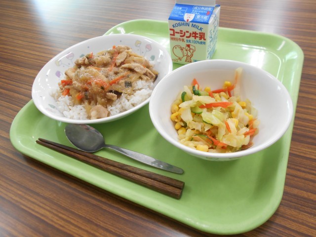 豚肉のおろし丼、かりかりアーモンドのサラダ、牛乳