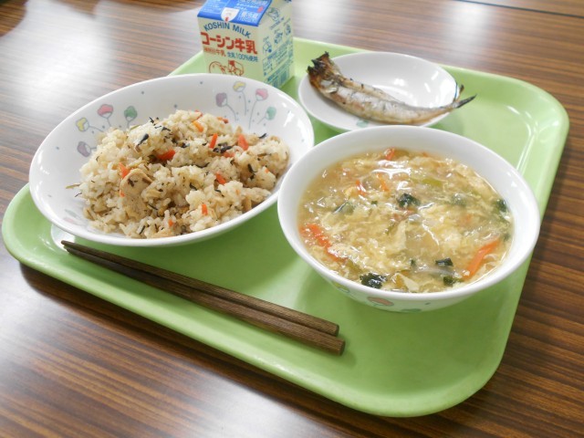 磯おこわ、ししゃもの香味焼き、かきたま汁、牛乳