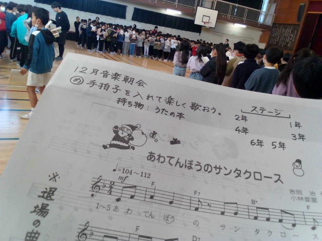今日は音楽朝会。あわてんぼうのサンタクロースを全校児童で歌いました。めあては、「手拍子を入れて楽しく歌おう」朝会でもしっかりめあてを明確にし、活動しています。退場は「ジングルベル」を歌いながら♪