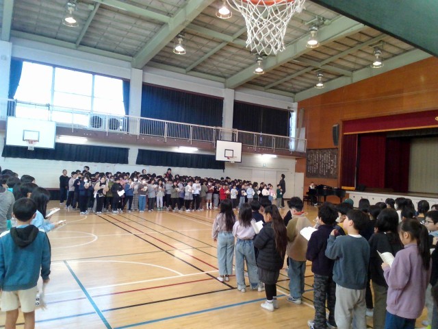 寒い毎日ですが、心温まる素敵な音楽朝会でした。多くの子どもたちが笑顔です。多くの教職員が笑顔です。音楽の力です。音楽朝会の力です。(校長)