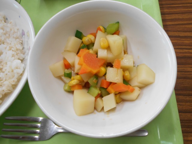 さいころサラダは、白、緑、オレンジ、黄色の野菜で、クリスマスツリーをイメージしました。調理員さんが人参をもみの木に型どってくれました。