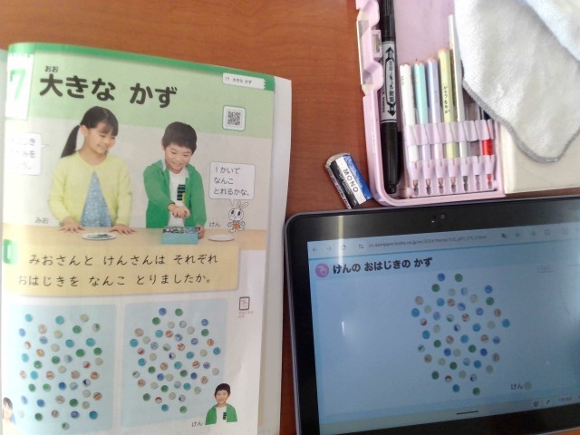 1年生の算数です。一人一台端末と教科書、黒板、電子黒板を見ながら、子どもたちは「大きなかず」について学習を深めています。たくさんあるおはじきをどうやって数えたら、より効率的に正確に数えられるか…、経験をとおして学んでいます。そして、気付いてきました。10のまとまりのよさに…。(校長)