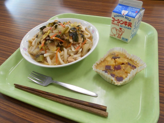 冬野菜のかけうどん、さつまいも黒糖蒸しパン、牛乳