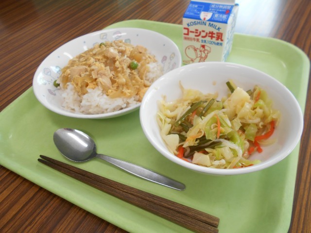 あぶたま丼は、親子丼に油揚げをプラスした給食オリジナルメニューです。