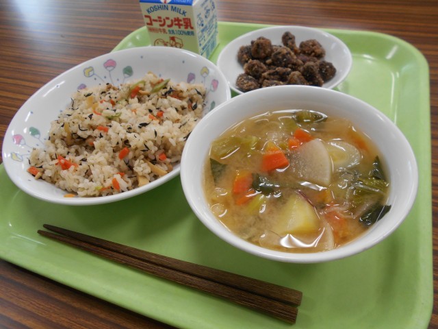 五目ごはん、じらの竜田揚げ、いものこ汁、牛乳