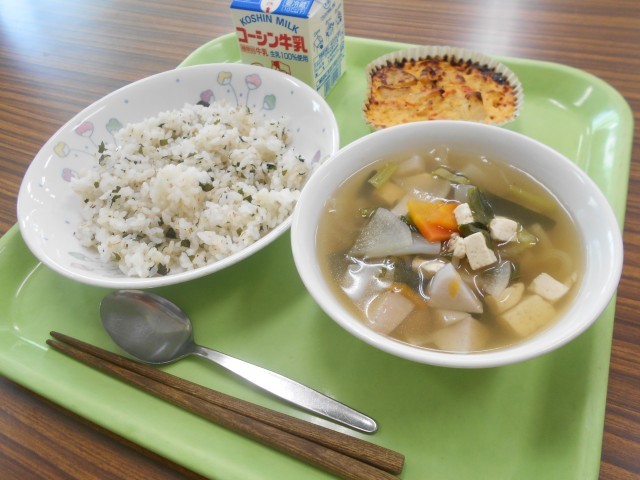 茎わかめ入りごはん、和風卵焼き、けんちん汁、牛乳