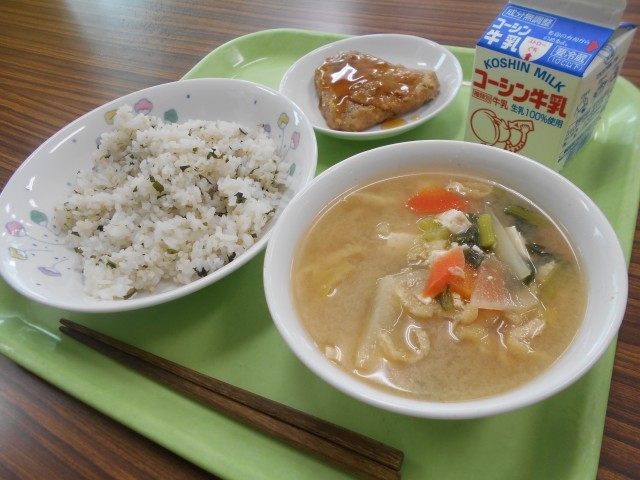 わかめごはん、いわしハンバーグ、みそ汁、牛乳