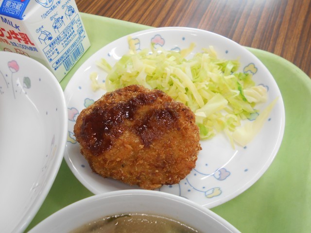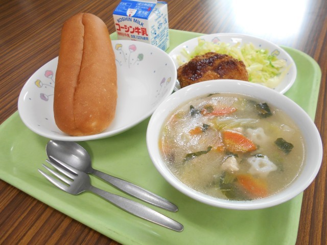 ミルクコッペパン、ツナカレーコロッケ、キャベツ、白菜とマカロニのスープ、牛乳