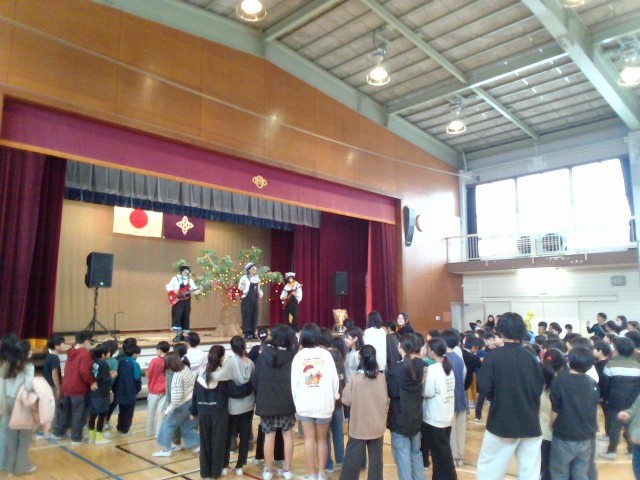 高島平一丁目町会主催「高一マルシェinクリスマス」に出演した学生バンド「Joker Pug(ジョーカーパグ)」の方々が、全校朝会、中休み、昼休みにミニコンサートを開催してくださいました。これは、5年生有志の子どもたちが企画したミニコンサートです。昼休みは、高島平新聞が取材に来てくださいました。子どもたちが企画したミニコンサートを開催できたこと、歴史的な1日だと考えています。(校長)