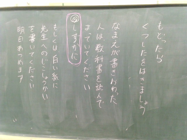 写真は、3年教室の黒板です。今日は身体測定がありました。身体測定が終わった後の活動について、分かりやすく指示が書いてあります。子どもたちが活動に困らないように配慮された内容です。