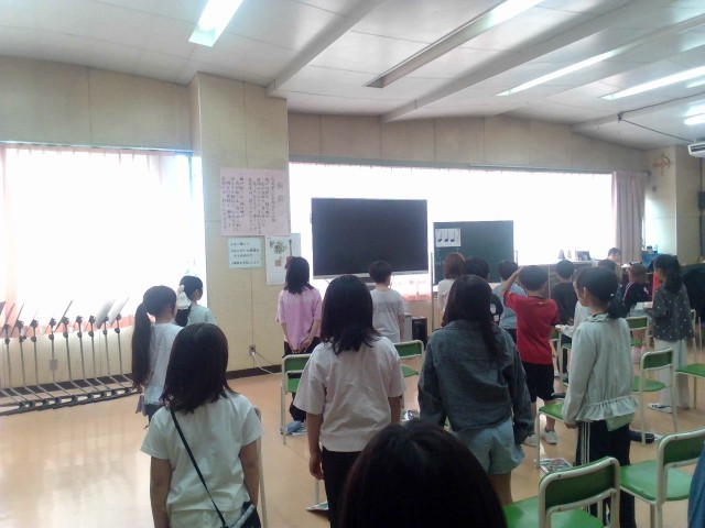 終盤、「校舎から見えるシャトレーゼに響く歌声で歌いましょう」という指導者の声掛けで、子どもたちはさらに意欲を向上!校歌の1番と2番の歌声が音楽室に響き渡りました。素晴らしい音楽の授業でした。(校長)