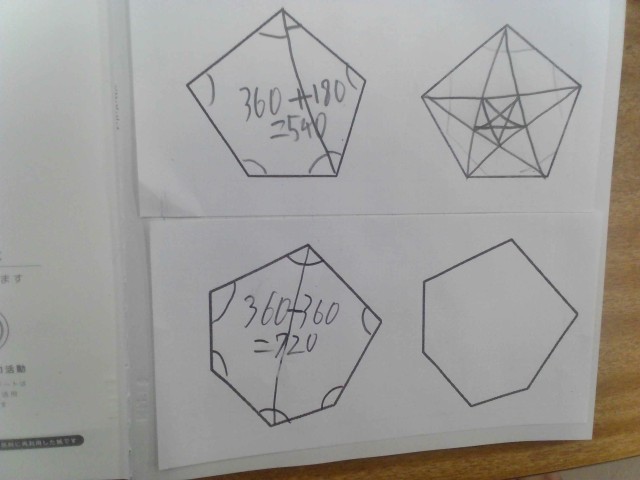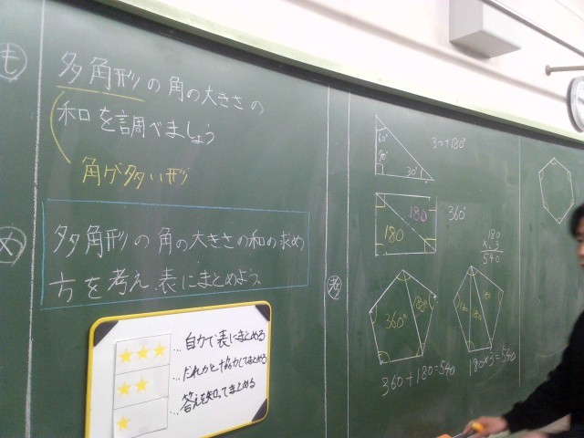 「多角形の角の大きさの求め方を考え、表にまとめよう」というめあてです。子どもたちは、五角形や六角形の角の大きさの和を様々な方法で求めています。求め方を図で表したり、式で表したりしながら、いくつかの考え方を比較し、きまりを見付けています。素晴らしい授業展開です。