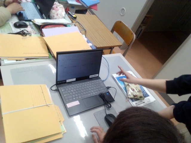 ことばの教室職員室では、今年度より運用を開始する「デジタル連絡帳」の使用方法について確認作業を進めていました。デジタル連絡帳の運用によって、ことばの教室担当教員と在籍学級担任、そして保護者の連絡を円滑に行うことができます。