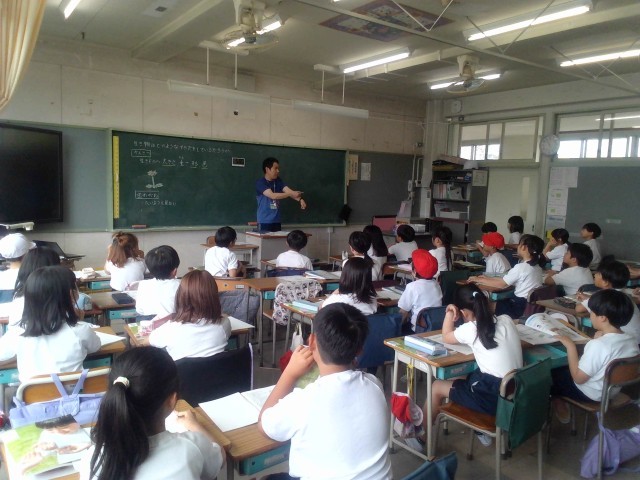 3年生の理科です。学習内容は、「生き物はどのようなすがたをしているだろうか」という内容。生きものの「大きさ」「重さ」「形」「色」に着目して観察するということが、黒板にしっかり書かれていました。