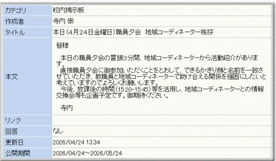 地域コーディネーターという方々が学校にはいます。学校と地域の架け橋となり、学校のため、子どもたちのため、教職員のため、地域のために動いてくださる、助けてくださる方々です。今日、職員夕会(教職員の打合せ)に地域コーディネーターの方々が参加し、活動報告をしてくださいます。ありがたいことです。(校長)