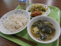 【本日のメニュー】ごはん、とりの唐揚げ、アーモンド和え、ほうれん草のみそ汁、牛乳...