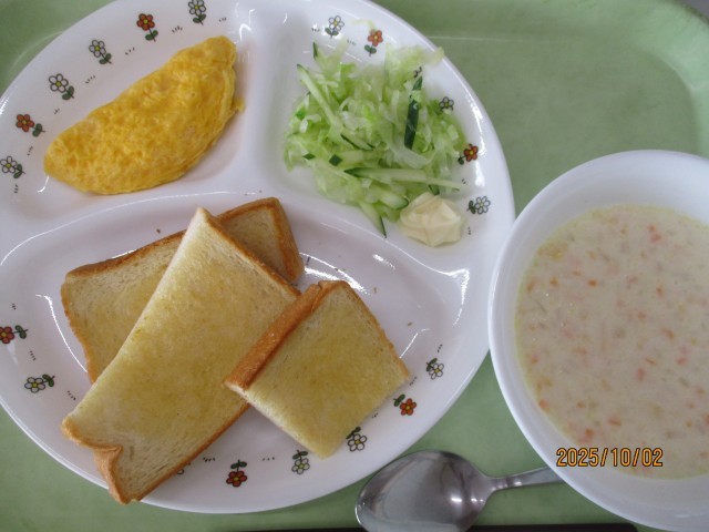 シナモントースト、ミルクスープ、オムレツ、ボイル野菜