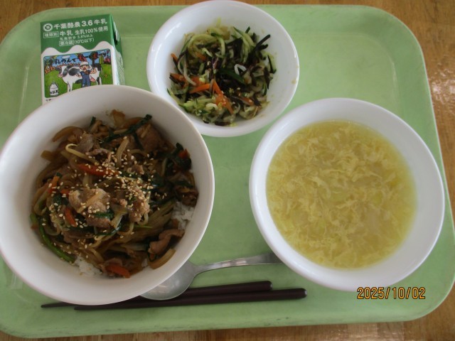 プルコギ丼、牛乳、ひじきサラダ、コーンたまごスープ