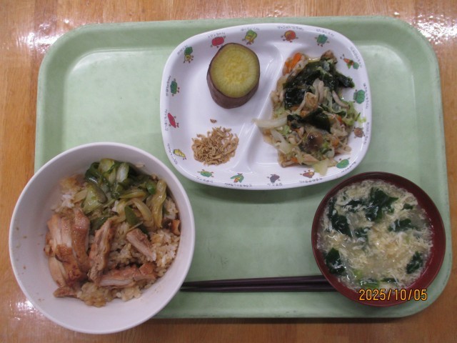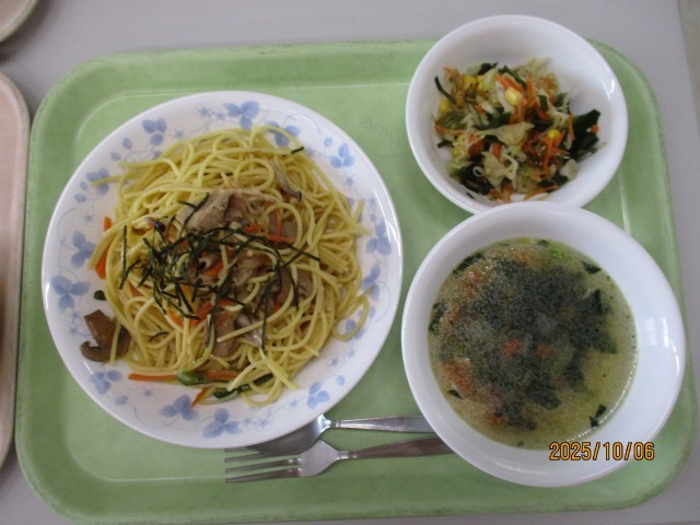 10月5日(日)おやつ~10月6日(月)昼食 公開日 2025/10/09 更新日 2025/10/09 昼食のご紹介 10月5日(日)おやつヨーグルトパンケーキ、アイスティー10月5日(日)夕食鶏肉のきじやき丼、むらくも汁、和風きのこサラダ、ふかしいも、あまじゃっこ10月6日(月)朝食ごはん、みそ汁、鮭の塩やき、野菜のにもの、オレンジ10月6日(月)昼食きのこパスタ、牛乳、海藻サラダ、ひよこ豆スープ写真はおやつ・夕・朝・昼の順です。 +1