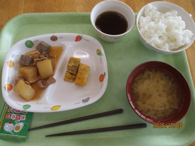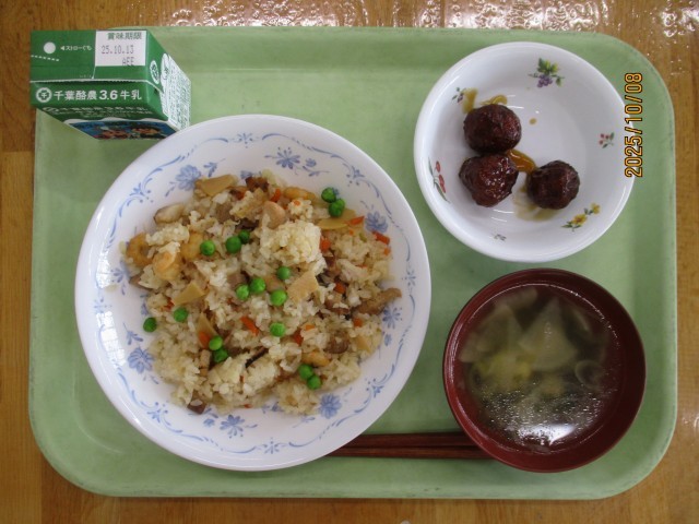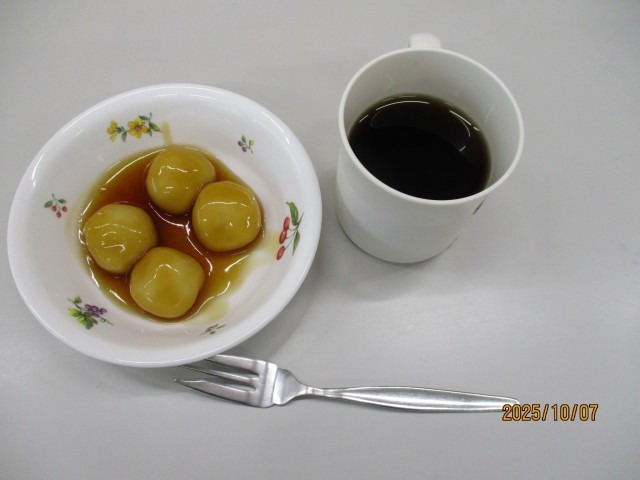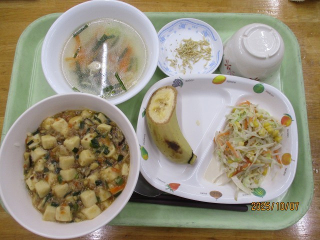 10月7日(火)おやつ~10月8日(水)昼食 公開日 2025/10/09 更新日 2025/10/09 昼食のご紹介 10月7日(火)おやつみたらし白玉、麦茶10月7日(火)夕食マーボー豆腐丼、ごぼうサラダ、中華スープ、あまじゃっこ、バナナ10月8日(水)朝食ごはん、みそ汁、あつやきたまご、豚肉とだいこんに、ふりかけ10月8日(水)昼食中華おこわ、牛乳、肉だんご、わかめスープ写真はおやつ・夕・朝・昼の順です。 +1