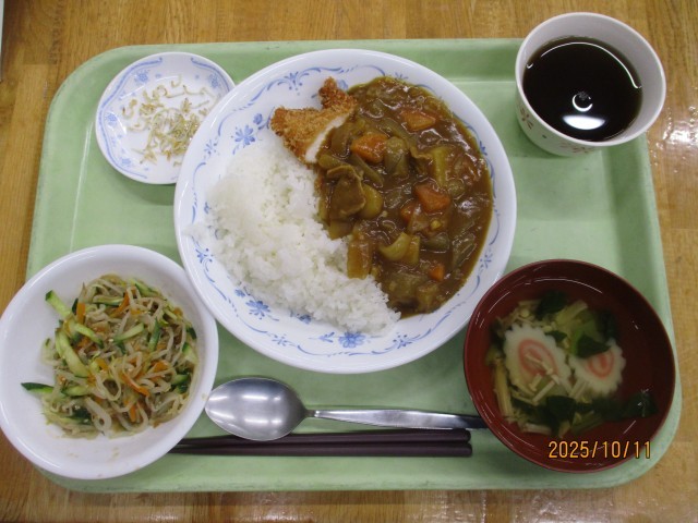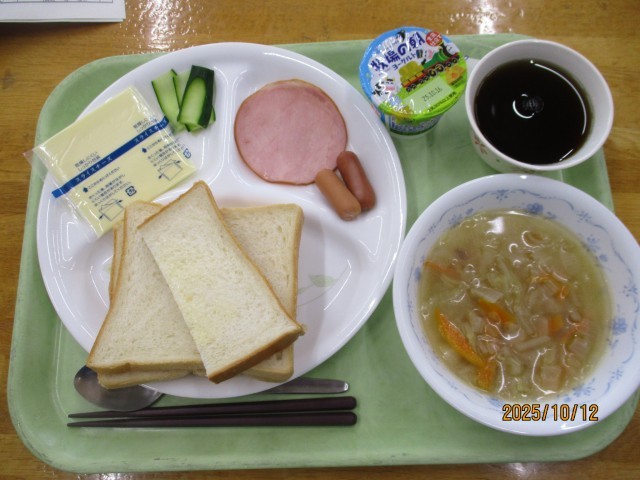 10月11日(土)おやつ~10月12日(日)昼食 公開日 2025/10/21 更新日 2025/10/20 昼食のご紹介 10月11日(土)おやつ紅白ゼリー、麦茶10月11日(土)夕食チキンカツカレー、すまし汁、野菜のこうみあえ、あまじゃっこ10月12日(日)朝食セルフサンド、野菜スープ、ボイルウインナー、ヨーグルト10月12日(日)昼食さつまいもおこわ弁当、牛乳写真はおやつ・夕・朝の順です。