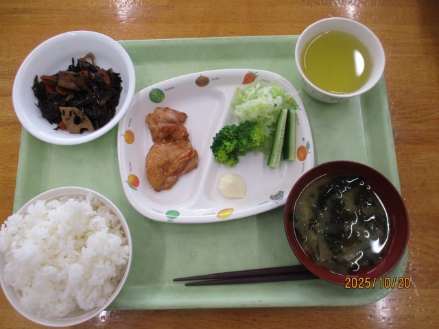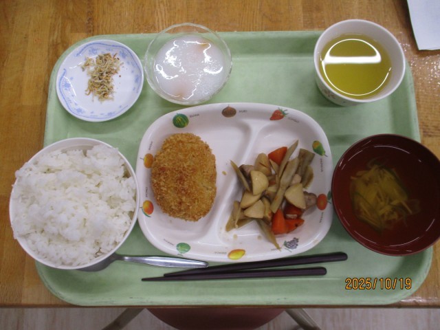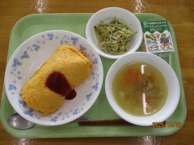 10月19日(日)おやつ~10月20日(月)昼食 公開日 2025/10/21 更新日 2025/10/20 昼食のご紹介 10月19日(日)おやつたべっこ動物、ヤクルト10月19日(日)夕食ごはん、すまし汁、カレーコロッケ、野菜のにもの、あまじゃっこ、カルピスゼリー10月20日(月)朝食ごはん、みそ汁、鶏のてりやき、生揚げとひじきに、ボイル野菜10月20日(月)昼食オムライス、牛乳、ごまだれサラダ、野菜スープ写真は夕・朝・昼の順です。