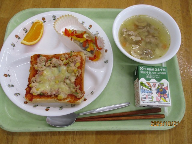 ツナピザトースト、牛乳、魚のレモン風味、ABCスープ、オレンジ