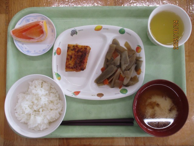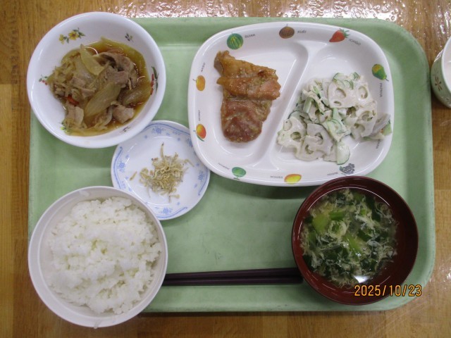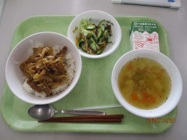 10月23日(木)おやつ~10月24日(金)昼食 公開日 2025/10/24 更新日 2025/10/24 昼食のご紹介 10月23日(木)おやつカルピスババロア、紅茶10月23日(木)夕食ごはん、かき玉汁、鶏肉のピリから焼き、れんこんのごまネーズ、肉じゃがに、あまじゃっこ10月24日(金)朝食ごはん、みそ汁、卵のちぐさ焼き、大根のきんぴら、グレープフルーツ10月24日(金)昼食豚丼、牛乳、野菜スープ、わかめサラダ写真はおやつ・夕・朝・昼の順です。 +1