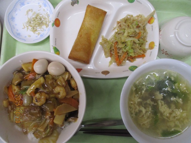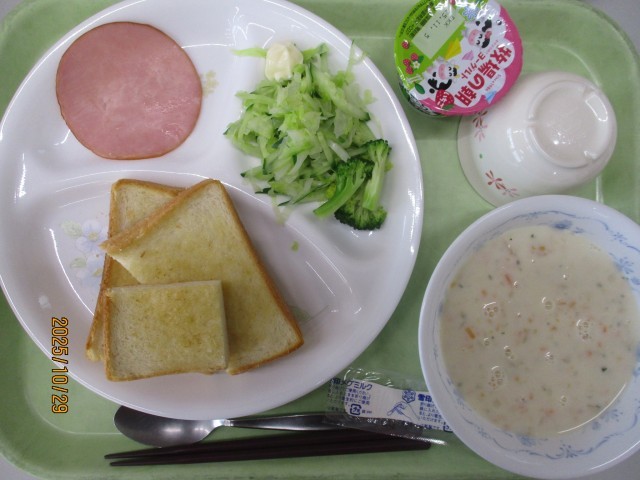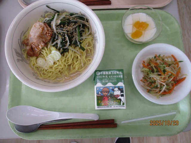 10月28日(火)おやつ~10月29日(水)昼食 公開日 2025/10/30 更新日 2025/10/30 昼食のご紹介 10月28日(火)おやつバナナマフィン、紅茶10月28日(火)夕食中華丼、かぼちゃの春巻き、野菜のごまず、レタスのスープ、あまじゃっこ10月29日(水)朝食シナモントースト、ミルクスープ、ボイル野菜、焼きハム、ヨーグルト10月29日(水)昼食とんこつラーメン、牛乳、中華サラダ、杏仁豆腐写真は夕・朝・昼の順です。