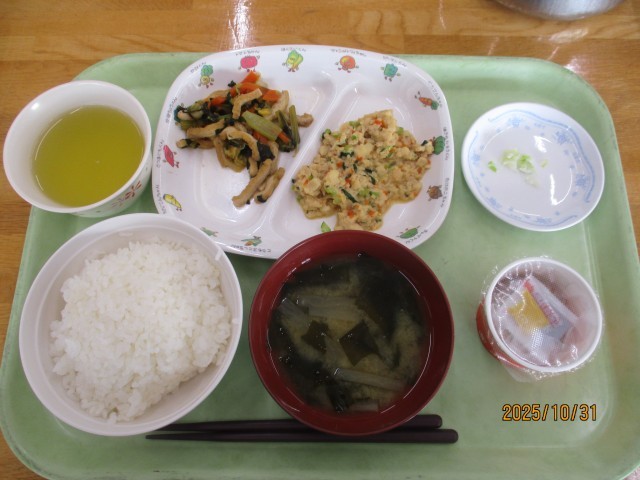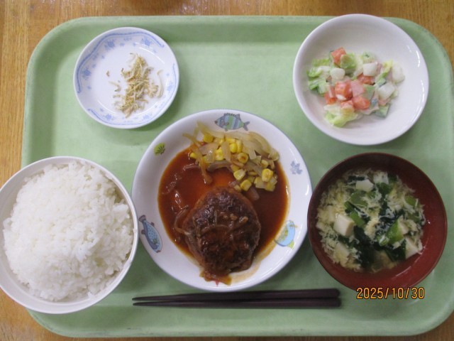 ごはん、かき玉汁、にこみハンバーグ、マセドアンサラダ、コーンソテー、あまじゃっこ