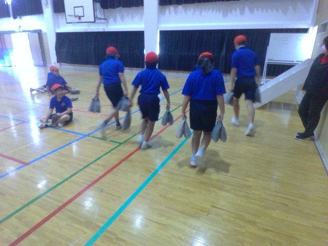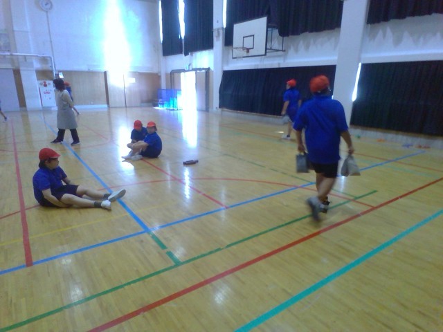 筋肉トレーニング中です。いつもと違い、一人ひとり砂袋を持っています。標準体重を計算して、余分な重さを実感しながら運動しました。