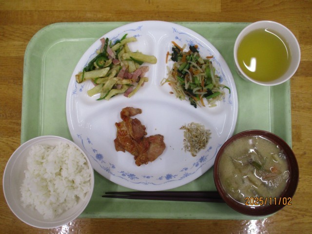 ごはん、利休汁、鶏肉のレモンソース、ガーリックじゃがピー、おひたし、あまじゃっこ