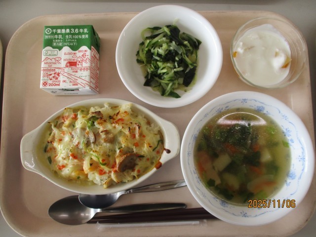 11月5日(水)おやつ~11月6日(木)昼食 公開日 2025/11/10 更新日 2025/11/10 昼食のご紹介 11月5日(水)おやつ豆腐ドーナッツ、お茶11月5日(水)夕食ごはん、みそ汁、さばのごぼうみそ焼き、豆腐のあんかけ、和風サラダ、あまじゃっこ11月6日(木)朝食ごはん、みそ汁、豚肉のしょうが焼き、切り干しのにもの、ナムル11月6日(木)昼食エビドリア、牛乳、わかめサラダ、芋とベーコンのスープ、ヨーグルトあえ写真は夕・朝・昼の順です。
