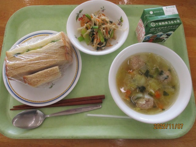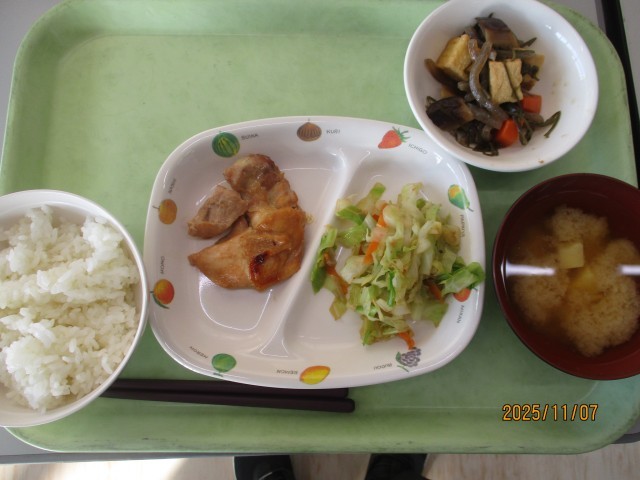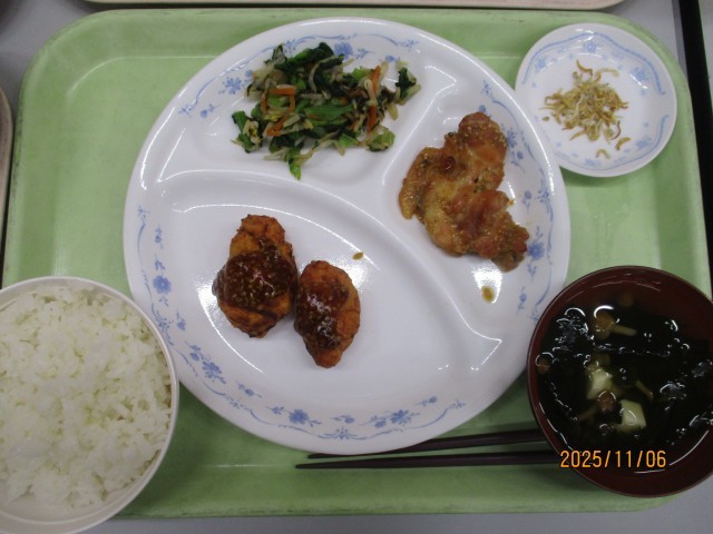 11月6日(木)おやつ~11月7日(金)昼食 公開日 2025/11/10 更新日 2025/11/10 昼食のご紹介 11月6日(木)おやつ鬼まんじゅう、お茶11月6日(木)夕食ごはん、すまし汁、鶏肉のピリから焼き、まさごあげ、いそかあえ、あまじゃっこ11月7日(金)朝食ごはん、鶏のてりやき、切り昆布のにもの、おひたし11月7日(金)昼食二食サンド、牛乳、ミートボールスープ、ささみサラダ写真はおやつ・夕・朝・昼の順です。 +1