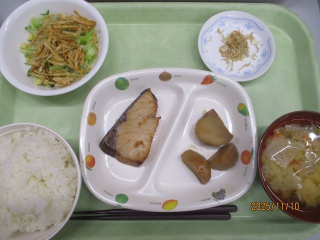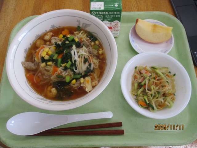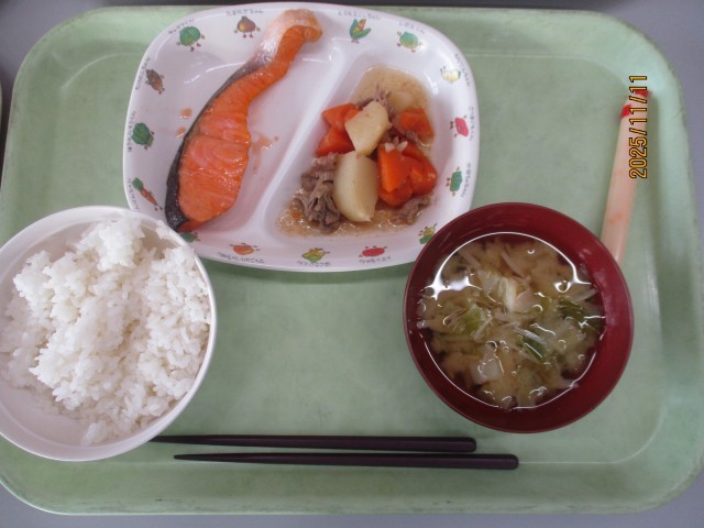 11月10日(月)おやつ~11月11日(火)昼食 公開日 2025/11/11 更新日 2025/11/11 昼食のご紹介 11月10日(月)おやつチョコチップクッキー、紅茶11月10日(月)夕食ごはん、豚汁、ツナコロッケ、わかめサラダ、あまじゃっこ11月11日(火)朝食ごはん、みそ汁、鮭の塩焼き、野菜のにもの、チーかま11月11日(火)昼食北海ラーメン、牛乳、中華サラダ、りんご写真はおやつ・夕・朝・昼の順です。 +1