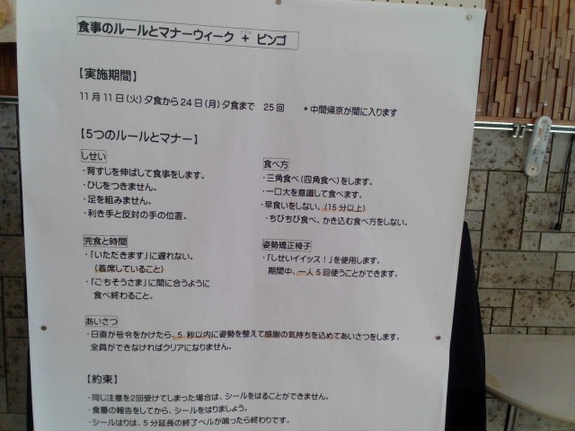 昨日(11日 火曜日)の夕食から食事のマナーウィーク・ビンゴに取り組んでいます。