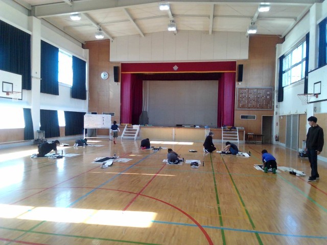 書き初めの練習を体育館で行っています。