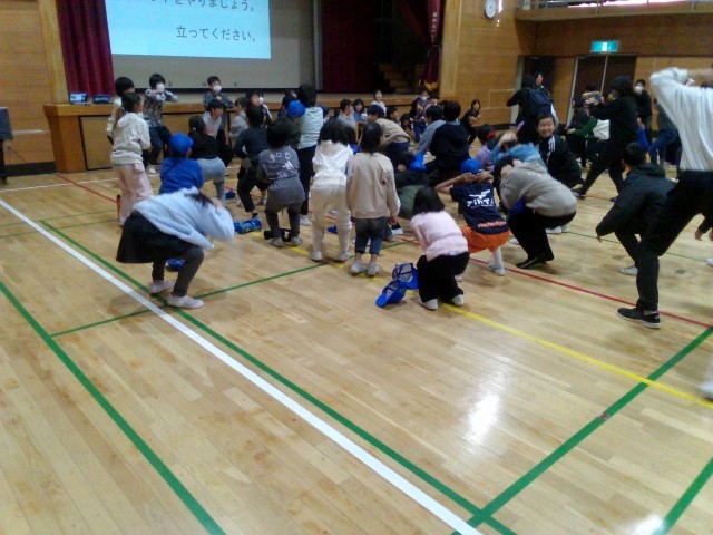 12月4日(木) 三校交流会⑨ 公開日 2025/12/04 更新日 2025/12/04 学校生活 各学年で交流が終わった後、体育館に全員集合しました。お互いの学校を紹介しました。写真は保田しおさい学校の紹介の様子です。1回スクワットをすると0.5キロカロリーを消費するというクイズを行った後実際に10回やってみました。