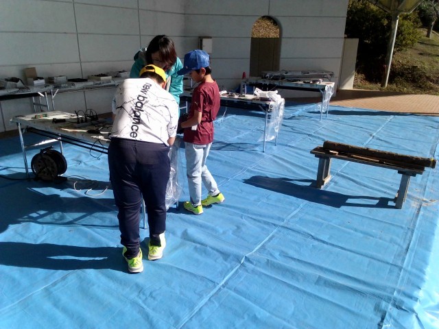 気を切り終わった人から、拾った葉っぱや花などを使って作品を作ります。