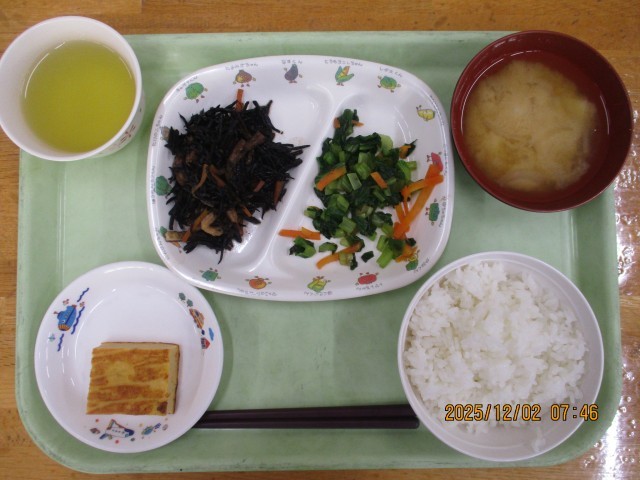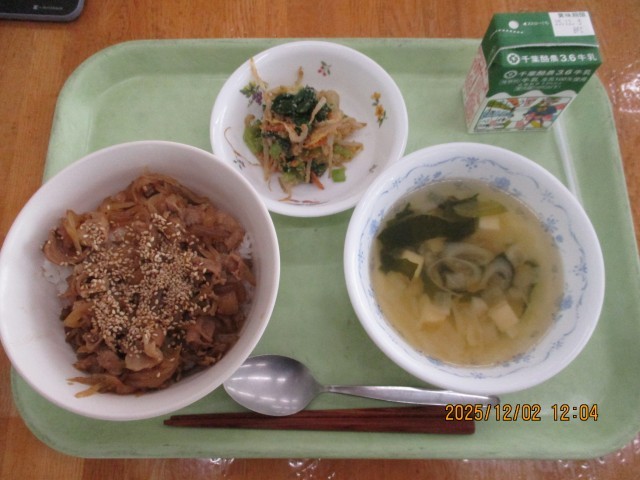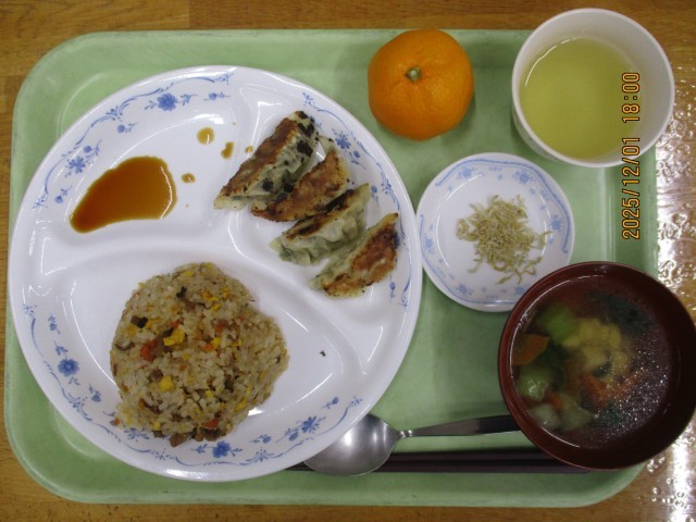 12月1日(月)おやつ~12月2日(火)昼食 公開日 2025/12/08 更新日 2025/12/08 昼食のご紹介 12月1日(月)おやつチーズ蒸しパン、紅茶12月1日(月)夕食五目チャーハン、チンゲンサイスープ、焼きギョーザ、あまじゃっこ、みかん12月2日(火)朝食ごはん、みそ汁、あつ焼きたまご、ひじきに、こまつなおひたし12月2日(火)昼食豚丼、牛乳、野菜のごまあえ、わかめスープ写真は夕・朝・昼の順です。