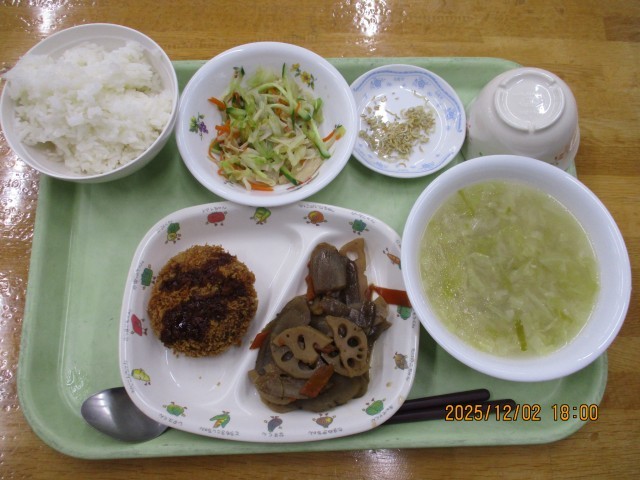 ごはん、メンチカツ、キャベツのスープ、きんぴらに、サラダ、あまじゃっこ
