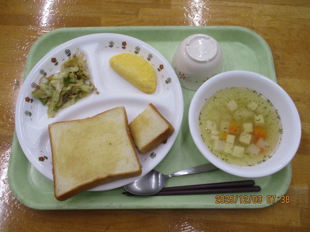シナモントースト、豆腐スープ、オムレツ、野菜いため