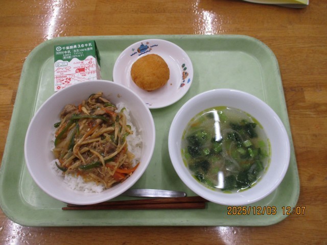 チンジャオロース丼、牛乳、ポテトもち、ひよこ豆スープ